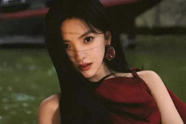 章若楠一袭红裙。